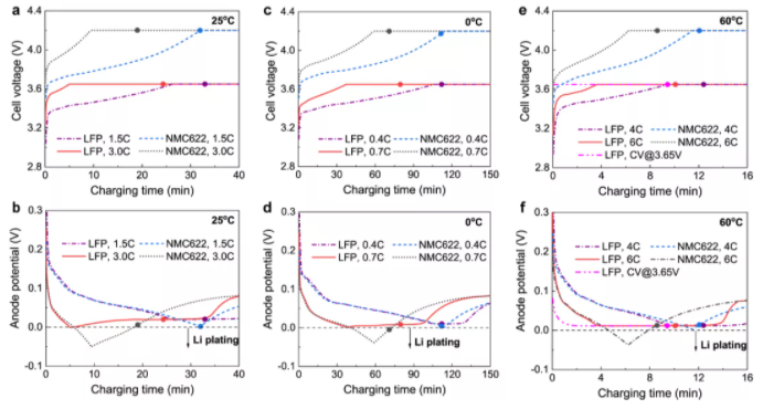 如圖3所示,磷酸鐵鋰電池在室溫下最快可實現20分鐘 (3C)充電,而在低溫(0℃)下,只能實現80分鐘(0.7C)充電。相反,如果在充電之前先將電池加熱至60℃,磷酸鐵鋰電池在6C的倍率下充電也沒有觀察到析鋰現象,而且充電時間可降至10分鐘以內。這也意味著,只要加熱速度足夠快,熱調控電池在任何環境溫度下都可以實現10分鐘快速充電。