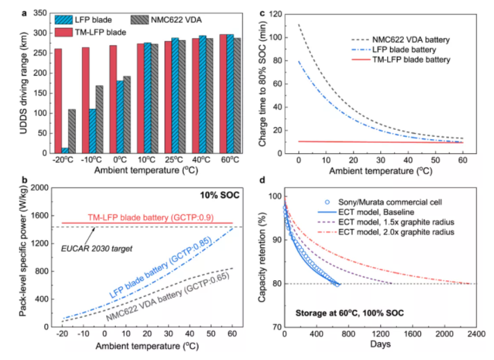基于團隊前期的自加熱電池結構,熱調控電池每升溫10℃大概消耗1.35%SOC,這意味著從-20℃加熱至60℃需要消耗10.8% SOC。也就是說,即使在-20℃環境中熱調控磷酸鐵鋰電池加熱后只剩余89.2% SOC,仍然可以提供大于250公里的續航里程(圖4a)。此外,該電池在-20℃, 10%SOC下的功率密度仍然達到~1500W/kg(圖4b)。更重要的是,所組裝的40kWh的電池包能夠實現大于300kW的峰值功率,這意味著百公里加速時間可維持在3秒以內,超越了特斯拉!