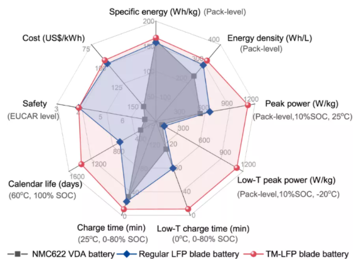 圖5:熱調控磷酸鐵鋰電池、傳統三元電池、磷酸鐵鋰刀片電池的性能指標雷達圖。