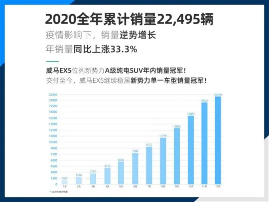 2020年,威馬沒有再給自己做預(yù)定的銷售目標(biāo),這一年,威馬完成了22495量的交付,同比增長(zhǎng)33.3%。