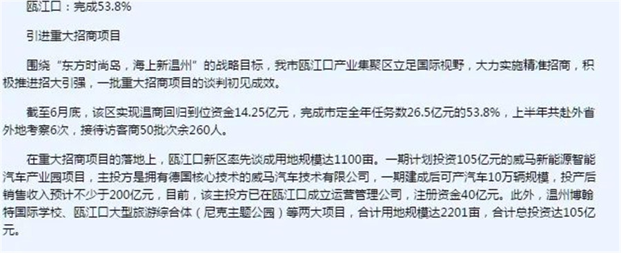 在收購Weltmeister的同時(shí),威馬在宜興成立宜興威馬,準(zhǔn)備投資宜興工廠,但由于種種原因這一計(jì)劃無疾而終。之后,威馬選擇把東南沿海的造車基地放在溫州。2016年5月,威馬汽車制造溫州有限公司(溫州威馬)成立,在一份2016年溫州市引進(jìn)重大招商項(xiàng)目的文件中,關(guān)于溫州威馬的信息,清楚的記錄了該項(xiàng)目的具體情況,包括完成進(jìn)度。