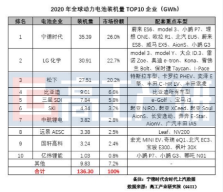 GGII數(shù)據(jù)顯示,2020年全球動(dòng)力電池裝機(jī)量TOP10企業(yè)依次是寧德時(shí)代、LG能源、松下、比亞迪、三星SDI、SKI、中航鋰電、遠(yuǎn)景AESC、國軒高科和億緯鋰能。