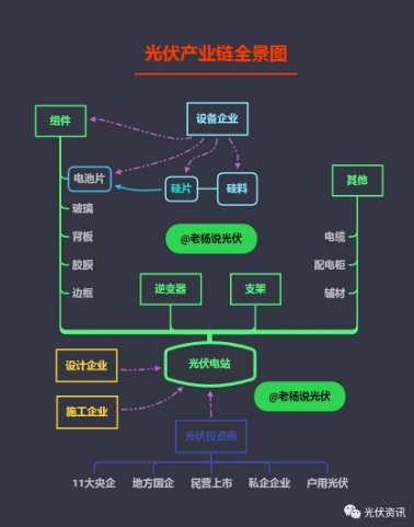眾所周知,光伏產(chǎn)業(yè)鏈有著一條明確而清晰的產(chǎn)業(yè)鏈,分別是硅料、硅片、電池片、組件、應(yīng)用系統(tǒng)五大環(huán)節(jié)。處于光伏產(chǎn)業(yè)鏈上游的為硅片,光伏產(chǎn)業(yè)中游主要涉及電池片及組件,下游主要為光伏發(fā)電系統(tǒng)。