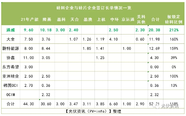 根據(jù)公開資料顯示,截至2020年底,大全新能源硅料產(chǎn)能達(dá)7萬(wàn)噸,2021大全7.5萬(wàn)噸硅料產(chǎn)能產(chǎn)能已被隆基、天合、晶澳、上機(jī)數(shù)控、中環(huán)等鎖定;新特2020年底硅料產(chǎn)能達(dá)7.2萬(wàn)噸,2021年隆基、晶澳、上機(jī)數(shù)控共鎖定新特11.69萬(wàn)噸硅料產(chǎn)能,遠(yuǎn)超其實(shí)際產(chǎn)能8萬(wàn)噸;東方希望硅料產(chǎn)能2021年預(yù)計(jì)產(chǎn)能3萬(wàn)噸;亞洲硅業(yè)2021年的2.5萬(wàn)噸硅料將全部供應(yīng)給隆基;2021年協(xié)鑫4.51萬(wàn)噸硅料產(chǎn)能已被上機(jī)數(shù)控、隆基股份、中環(huán)股份三家聯(lián)合鎖定,實(shí)際產(chǎn)能11萬(wàn)噸。