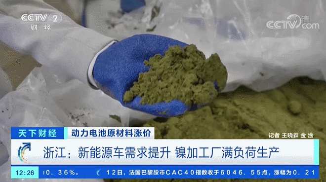 記者 王曉霖:我手上的這個綠色的粉末是氫氧化鎳,它是由鎳原礦通過濕法冶煉而來的,從海外運到國內的,它的鎳含量大約是在35%到40%,經過進一步加工去除雜質以后,就可以做成中間產品硫酸鎳。