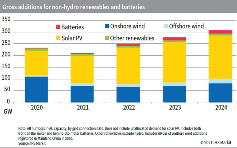 IHS表示,從2015年到2021年,太陽(yáng)能光伏(PV)系統(tǒng)的平均成本下降了54%,而太陽(yáng)能現(xiàn)在已成為“幾乎所有地方的首選資源”。它將占2021年至2024年之間新增的可再生能源新增產(chǎn)能的主要份額。