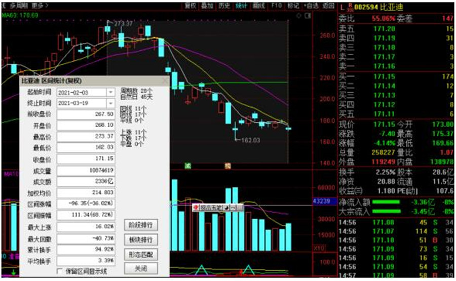 3月19日,比亞迪大跌4.1%。截止收盤,股價(jià)報(bào)收于171元,成交額44億,總市值為4897億。