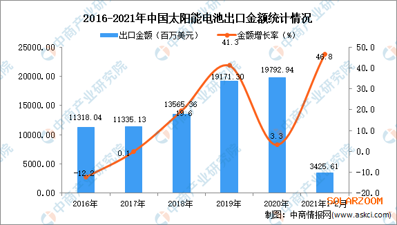 從金額方面來看,2021年2月太陽能電池出口金額為3425.61百萬美元,同比增長46.8%。