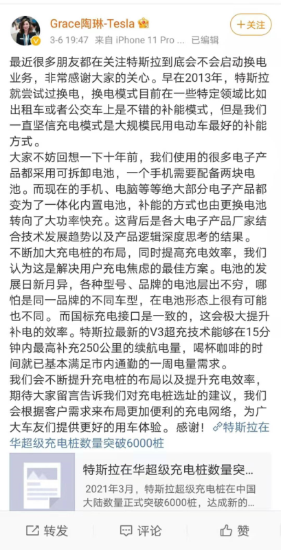 特斯拉全球副總裁陶琳在微博上回應“特斯拉是否會啟動換電模式”
