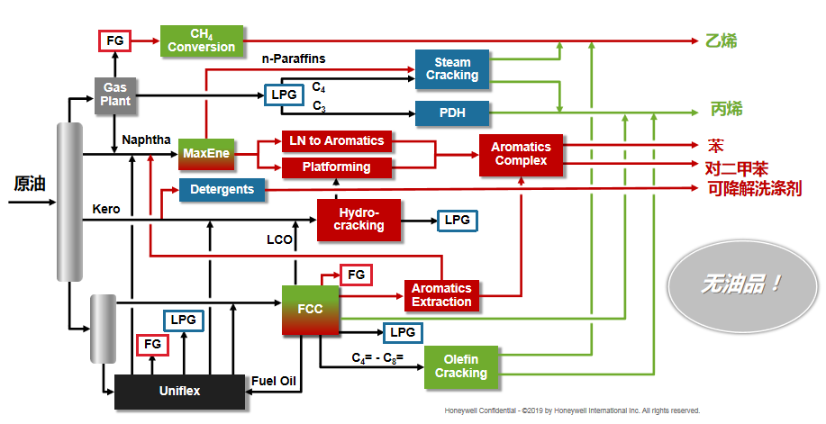 當然,還有不得不提的分子煉油技術,它能夠最大程度地利用原油。比如霍尼韋爾UOP的MaxEne,可以把直鏈和異構的石腦油分離出來,分別用來生產烯烴和芳烴,同時提高烯烴和芳烴的產率。如果煉廠不需要芳烴,則可以通過逆向異構化把異構烷烴轉化成直鏈烷烴,從而為烯烴裂解裝置提供更多的優質原料,提高產率。升級的方法不一而足,霍尼韋爾UOP可以給煉廠進行初步評估來探討煉廠升級的機會,根據裝置的規模和設備的極限提供最省錢和高效的改造建議。