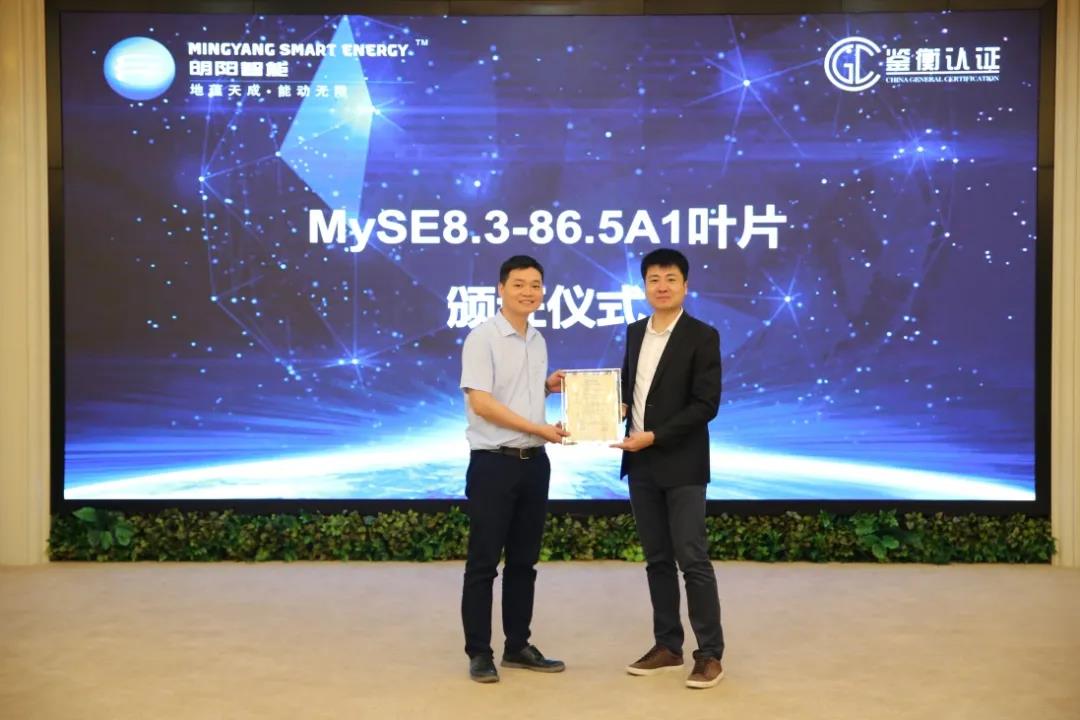 會上,鑒衡認證風能專家委員會為明陽智能的86.5A1葉片頒發了成果應用證書。由此,這款葉片成為全球已量產最長海上抗臺風純玻纖葉片。