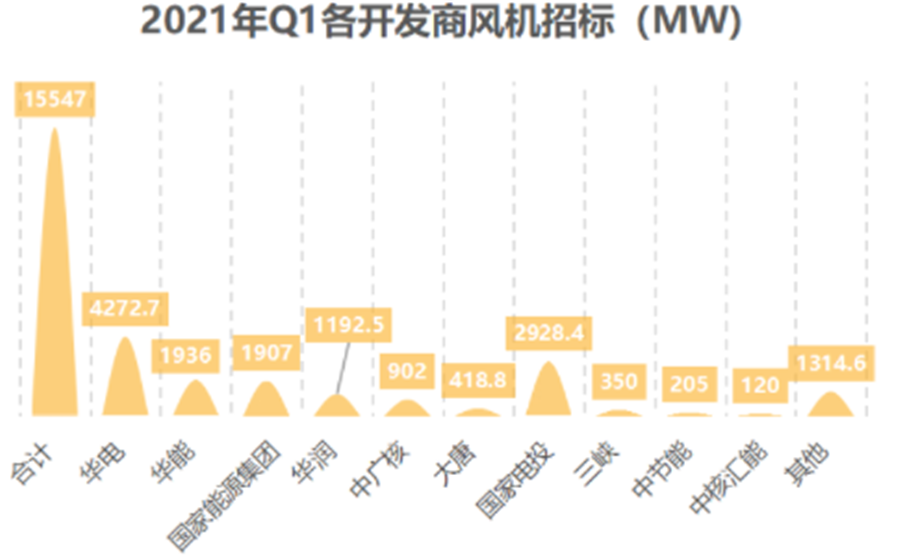 五大發(fā)電集團是風(fēng)機招標(biāo)的主力軍,占比54%。根據(jù)能見「風(fēng)電之聲」統(tǒng)計,今年一季度,發(fā)布風(fēng)機招標(biāo)最多的為華電集團,招標(biāo)容量超過4GW,占據(jù)總招標(biāo)容量的27.4%;排在第二的是近年正在大力轉(zhuǎn)向新能源的國家電投集團,今年一季度風(fēng)機招標(biāo)容量為2.9GW,占據(jù)總招標(biāo)容量的18.8%;緊隨其后的是華能集團,其累計招標(biāo)容量為1.9GW,占比12.4%。