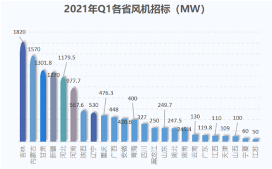 24個省份發(fā)布了風(fēng)機招標(biāo)。其中,有四省招標(biāo)容量均超1GW,分別為吉林(1820MW)、內(nèi)蒙古(1570MW)、甘肅(1301.8MW)、河北(1179.5MW)。