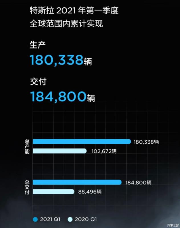 日前,特斯拉官方公布了該品牌2021年第一季度產(chǎn)能及交付數(shù)據(jù),其累計生產(chǎn)180338輛純電動車,交付184800輛。相比2020年第一季度,該品牌純電動車的生產(chǎn)量增加了77666輛,交付量增加了96304輛。此外,據(jù)官方表示,新款Model S和Model X全新生產(chǎn)設(shè)備已于第一季度完全安裝并通過測試,現(xiàn)已進入批量生產(chǎn)的初期階段。