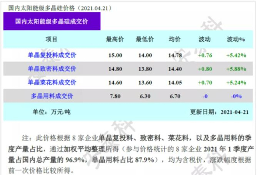 根據硅業分會21日公布的最新硅料價格監測顯示,本周多晶硅價格延續漲勢,國內單晶復投料價格區間在140-150元/kg,成交均價為147.8元/kg,周環比上漲5.42%。