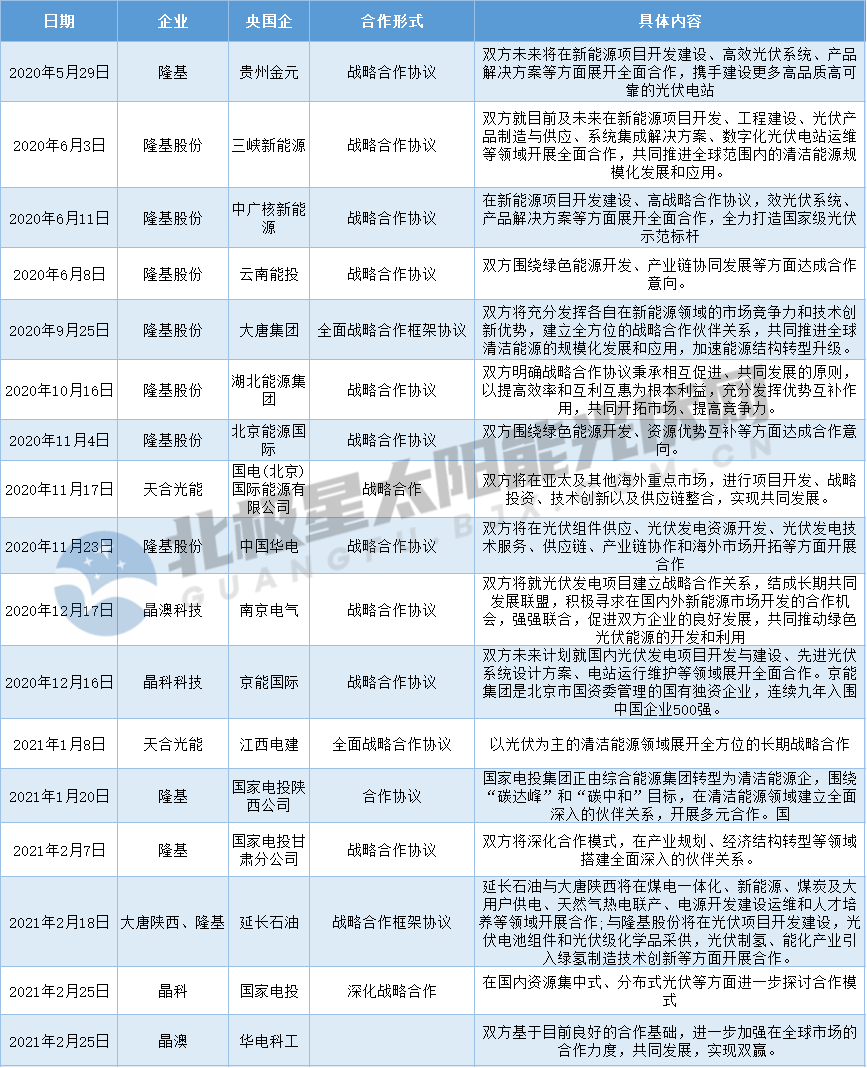 光伏組件是最接近終端客戶的環(huán)節(jié),具備供應(yīng)鏈管控、一體化程度高的TOP 5企業(yè)更利于掌握頭部客戶資源。更為關(guān)鍵的是,當(dāng)前我國央國企與民營企業(yè)間合作不再是單純的設(shè)備供應(yīng),而是進入強強聯(lián)合、深度合作的新階段。合作雙方將在光伏基地項目開發(fā)、綜合能源服務(wù)、產(chǎn)業(yè)鏈協(xié)同等方面深入合作,共同助力實現(xiàn)“雙碳目標”。以下為2020年以來TOP 5企業(yè)與央國企合作梳理: