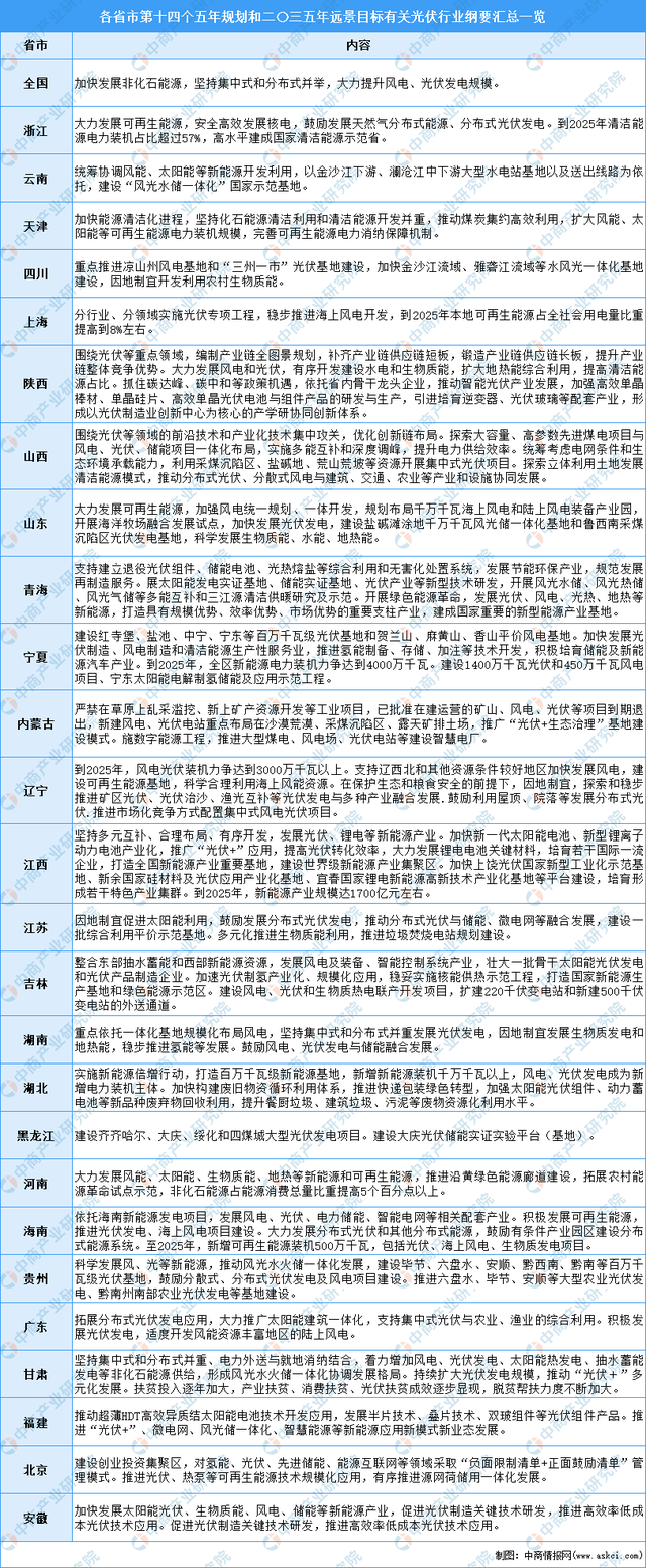 全國各地積極促進(jìn)光伏行業(yè)發(fā)展,中商產(chǎn)業(yè)研究院整理了全國各省市“十四五”發(fā)展規(guī)劃建議/綱要中有關(guān)光伏行業(yè)發(fā)展相關(guān)內(nèi)容,以供參考: