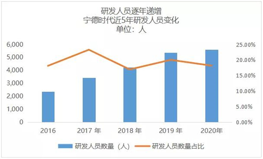 2020年,寧德時代研發在營收中的占比達到7.09%,擁有研發技術人員5592 名。