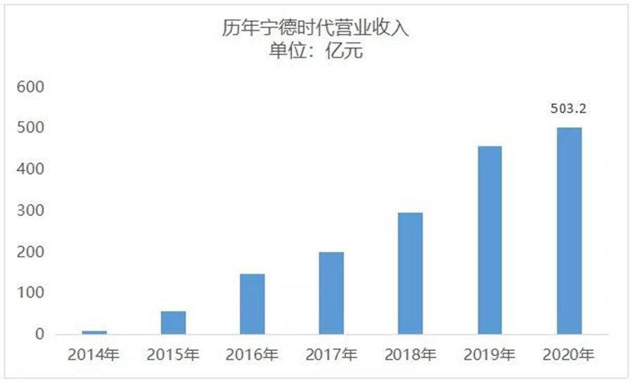 2020年,寧德時代實現營業總收入503.2億元,同比增長9.90%,歸屬于上市公司股東的凈利潤為55.8億元,同比增長22.43%。