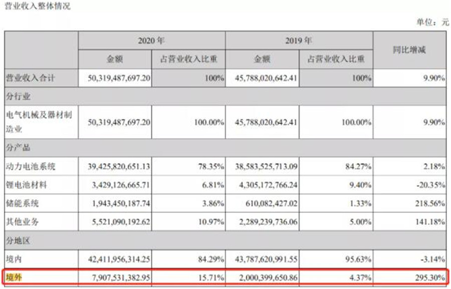 2020年,寧德時代境外業務營收為79.08億元,營收占比達到15.71%,而2019年這一數字僅為4.37%,同比大增295.30%。