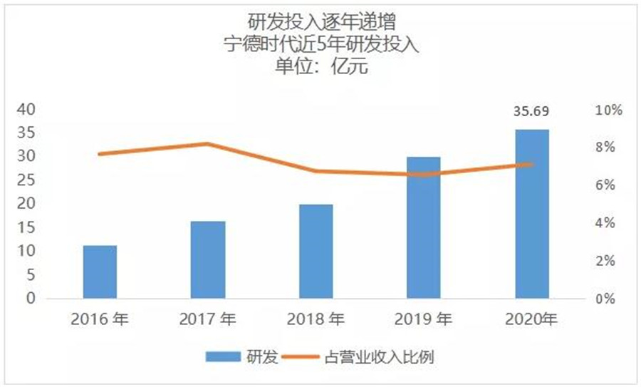 在營業收入大幅增長的同時,寧德時代的研發投入不僅沒有降低占比,而且呈現出增長的趨勢。
