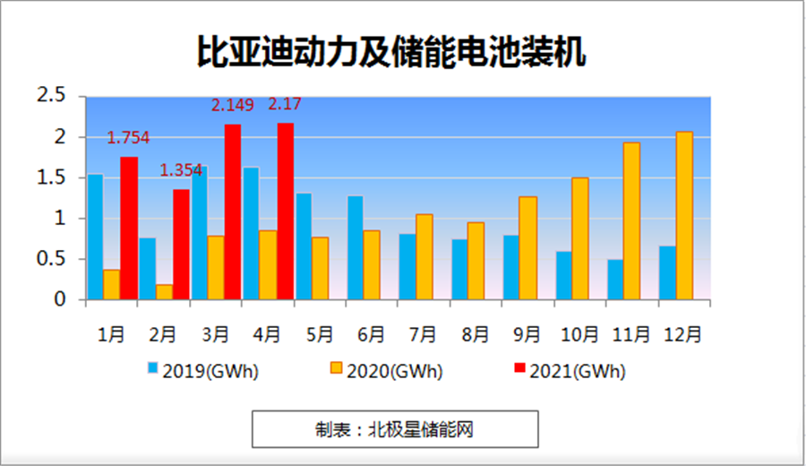 比亞迪2021年4月動力電池及儲能電池裝機總量約為2.170GWh
