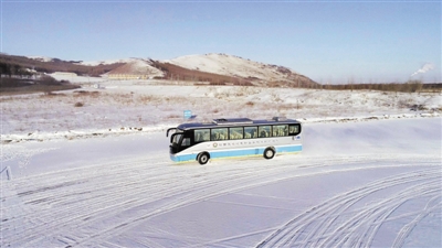 2019年1月,全氣候12米純電動(dòng)公路客車在內(nèi)蒙古海拉爾牙克石試驗(yàn)場(chǎng)開展冰雪路面測(cè)試。 理工華創(chuàng)供圖