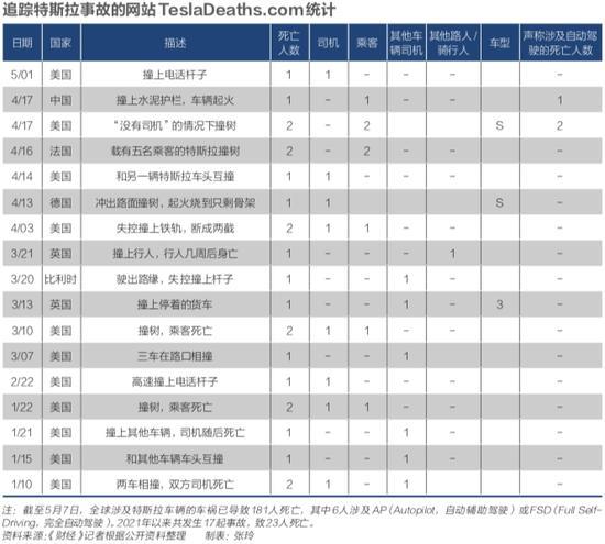 追蹤特斯拉事故的網站TeslaDeaths.com統計,截至5月7日,全球涉及特斯拉車輛的車禍已導致181人死亡,其中6人涉及AP(Autopilot,自動輔助駕駛)或FSD(Full Self-Driving,完全自動駕駛)。2021年以來共發生17起事故,致23人死亡。(見下圖表)