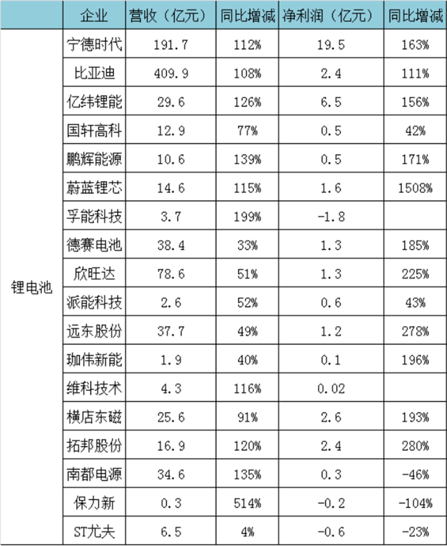 隨著下半年新能源汽車以及電動輕型車、電動工具、基站儲能等其它應用領域的市場需求進一步增長,預計國內鋰電上市公司的全年業績有望進一步增長。