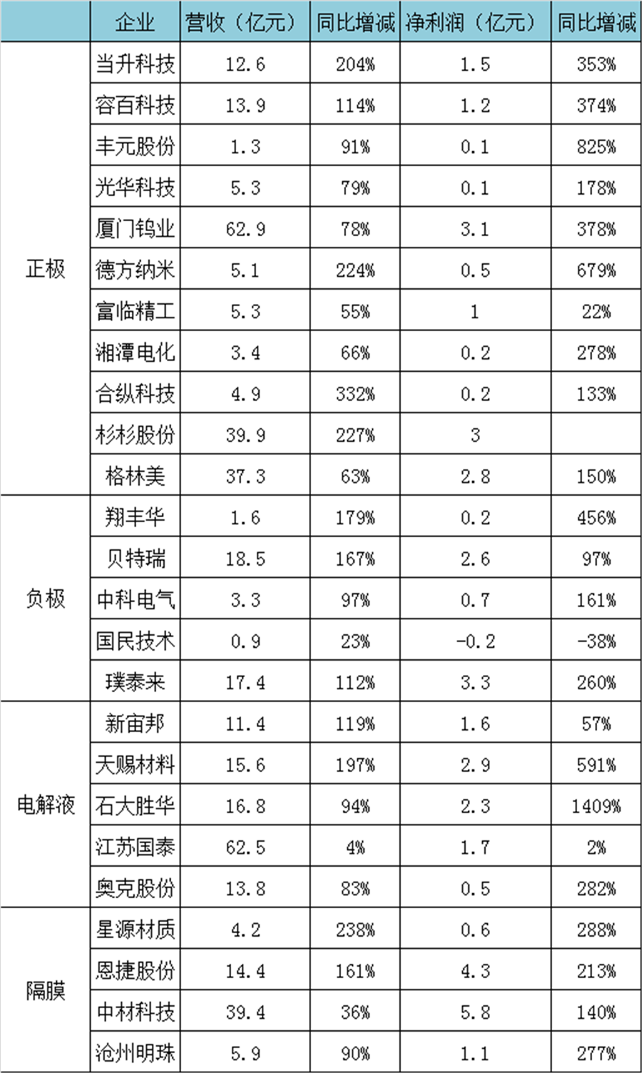除了正極材料之外,負極、隔膜和電解液等材料也因市場需求增長帶動,助推上述領域的頭部企業營收凈利大幅增長。
