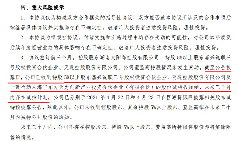 在此次公告中,風險提示對公司業績的影響需視雙方后續具體合作協議的簽訂和實施情況而定。還提示了公司有三個大股東在未來三個月內存在減持計劃。