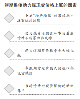 李學剛介紹,短期來看促使動力煤現貨價格上漲的因素有5個。一是重啟“增產增供”效果短期內沒有達到預期;二是動力煤資源偏緊和市場看漲情緒不斷累積和發酵;三是動力煤期貨價格率先大幅上漲;四是參照期貨定價模式快速推高現貨煤價;五是市場情緒對現貨煤價的助漲作用。