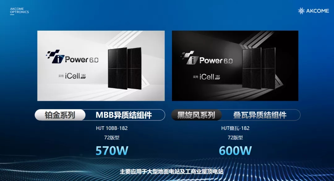 愛康Ipower6.0搭載182大尺寸硅片,共有兩個系列,均為72版型。其中一種是鉑金系列MBB異質結組件,最高功率570W;一種是黑旋風系列疊瓦異質結組件,功率最高可以達到600W,轉換效率達22%以上,最大功率溫度系數-0.24%/℃。主要應用于地面集中式電站和大型的分布式屋頂電站。