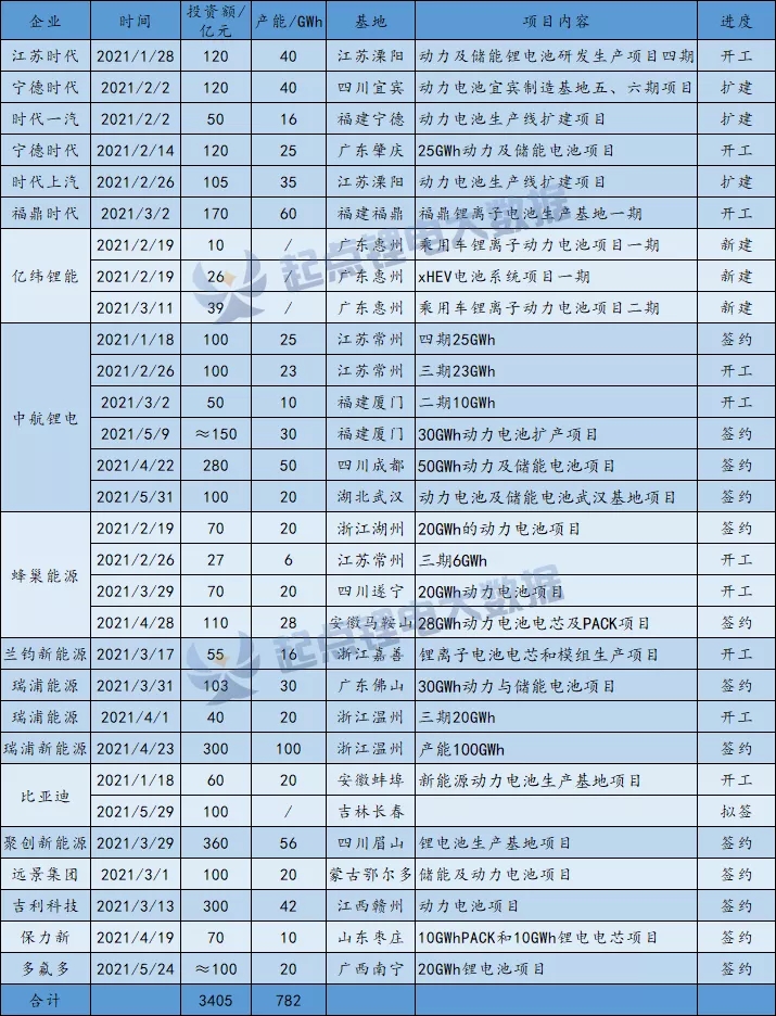 據起點鋰電大數據不完全統計,今年以來國內動力電池擴產項目已達30起,總投資額達到3400億元,對應動力電池產能超過780GWh。