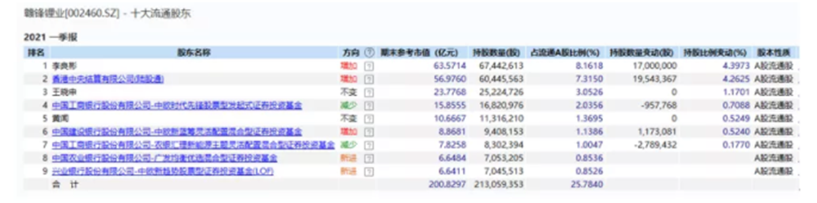 在贛鋒鋰業上漲期間,機構投資者獲利豐厚。從2021年一季報公司披露的前十大流通股中可以看到,多位明星基金經理赫然在列,包括中歐基金的代表人物周蔚文、周應波,農銀匯理的2020年度業績冠軍趙詣,可謂眾星云集。