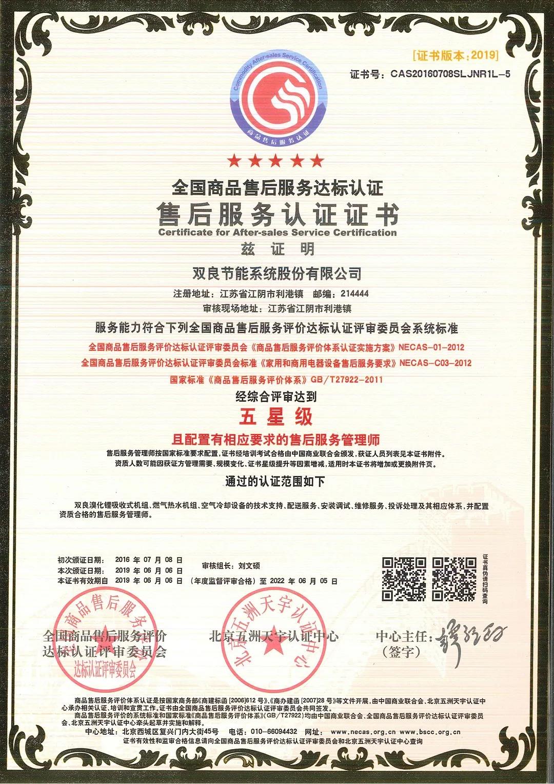 BSCC權威認證:雙良節能雙良溴化鋰吸收式機組、燃氣熱水機組、空氣冷卻設備的售后服務符合CTEAS1001-2007《CTEAS售后服務體系完善程度認證評價規范》標準要求,具有完善的售后服務體系,綜合評審達到七星級(卓越)。CTEAS七星級(卓越)售后服務認證是對企業售后服務體系完善程度評價的專業標準體系,在國家標準基礎上提出了更高要求,獲得證書的企業意味著不僅具有完善的售后服務體系,售后服務能力在國家處于一流水平,為目前最高的售后服務認證等級。