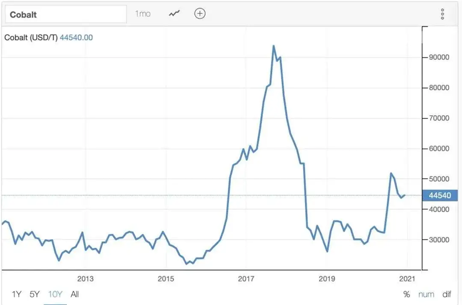 其中,鈷金屬大部分分布在剛果(金),因為長年戰亂,供給極不穩定,價格波動劇烈,很多電池廠商一直在想辦法降低鈷含量,包括特斯拉和長城旗下的豐巢能源都喊出“無鈷電池”,鈷的價格也從2018年上半年的9萬美元/噸下降至現在的4.45萬美元左右,近乎腰斬。