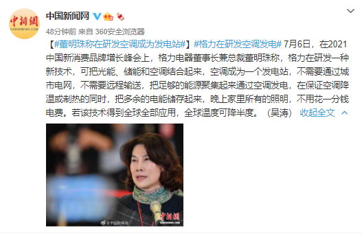 【#董明珠稱在研發空調成為發電站#】#格力在研發空調發電# 7月6日,在2021中國新消費品牌增長峰會上,格力電器(50.110, 0.00, 0.00%)董事長兼總裁董明珠稱,格力在研發一種新技術,可把光能、儲能和空調結合起來,空調成為一個發電站,不需要通過城市電網,不需要遠程輸送,把足夠的能源聚集起來通過空調發電,在保證空調降溫或制熱的同時,把多余的電能儲存起來,晚上家里所有的照明,不用花一分錢電費。若該技術得到全球全部應用,全球溫度可降半度。
