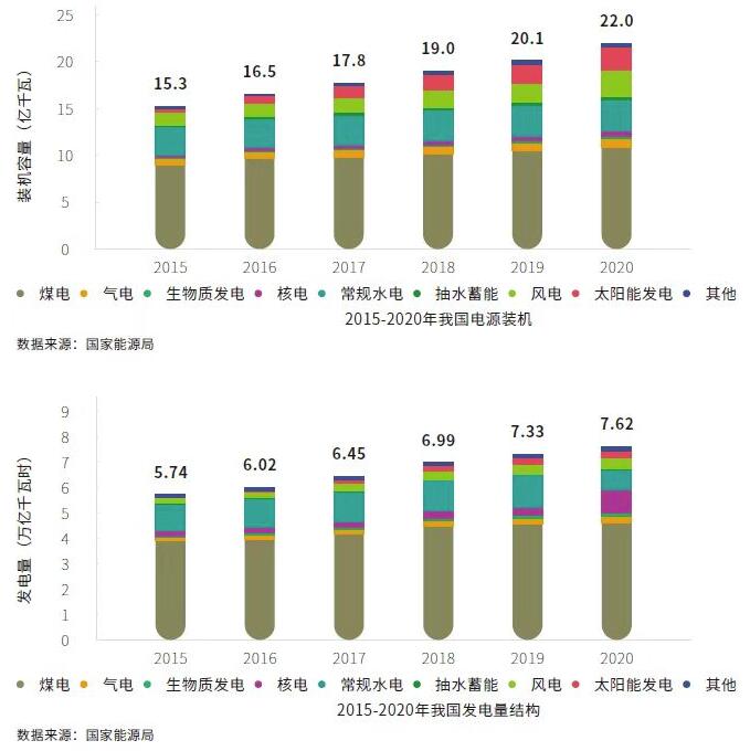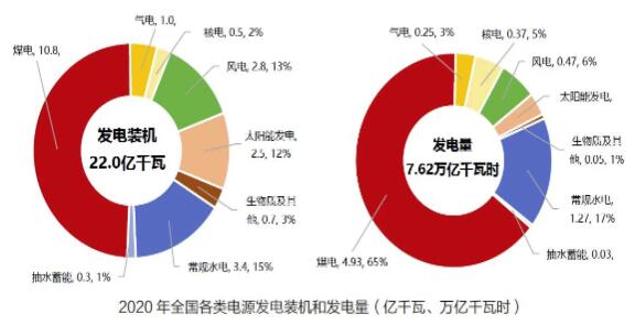 《中國電力發展報告2020》指出,“十三五”期間,我國電力裝機結構持續優化,電力工業綠色低碳轉型成效顯著。截至2020年底,非化石能源消費比重達到15.9%,超額完成“十三五”規劃目標;非化石能源裝機達到9.8億千瓦,占全國發電總裝機的45%;水電(含抽蓄)裝機達到3.7億千瓦;風電、太陽能合計裝機達5.3億千瓦,生物質發電裝機超過2700萬千瓦,均超額完成“十三五”規劃目標。