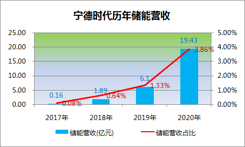 受政策環(huán)境影響、新能源汽車市場提振動(dòng)力電池需求,自上市以來寧德時(shí)代便穩(wěn)穩(wěn)坐上國內(nèi)電池裝機(jī)排名C位、且市占率超過50%,總營收連年增長。在動(dòng)力電池領(lǐng)域之外,寧德時(shí)代另一大核心業(yè)務(wù)——儲能系統(tǒng)營收也實(shí)現(xiàn)連年翻倍式增長、2020年實(shí)現(xiàn)儲能總營收19.43億元,儲能在總營收所占比重也快速提升達(dá)到3.86%。