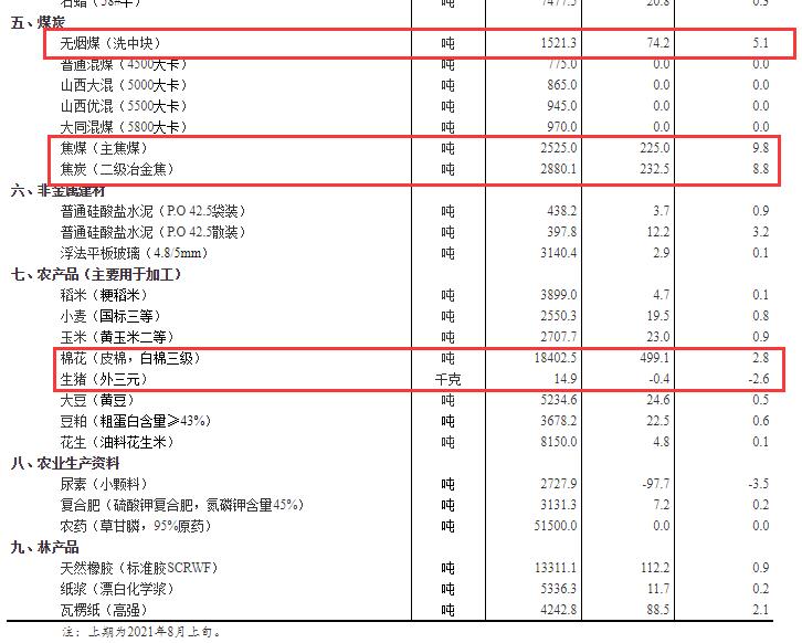 煤炭大類中,焦煤(主焦煤)價格報2525元/噸,環(huán)比漲9.8%;焦炭(二級冶金焦)價格報2880.1元/噸,環(huán)比漲8.8%;無煙煤(洗中塊)價格報1521.3元/噸,環(huán)比漲5.1%。