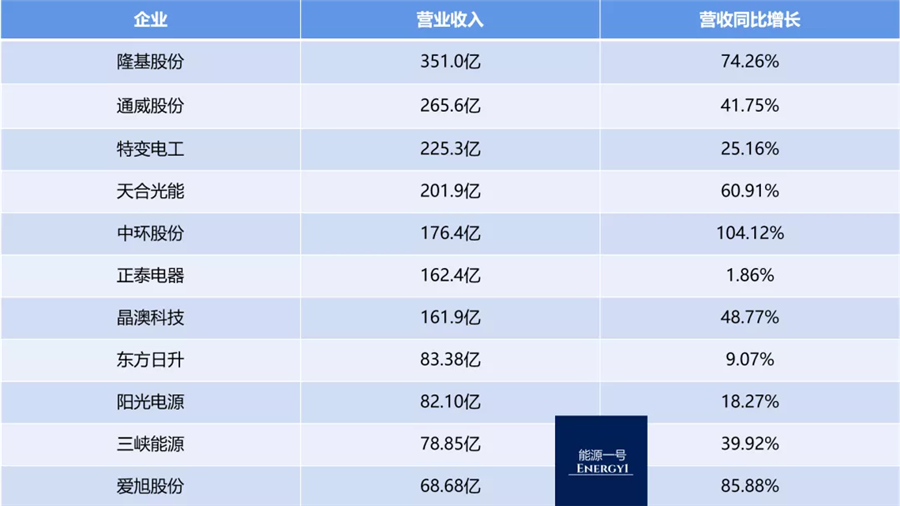 今年上半年中國光伏上市公司A股的財報已經出爐,總計2900多億營收、300余億凈利。其中,營收最高的前十大公司分別是隆基股份、通威股份、特變電工、天合光能、中環股份、正泰電器、晶澳科技、東方日升和陽光電源、三峽能源。營收同比增幅較高的有中環股份、愛旭股份、隆基股份、天合光能、福萊特、上機數控、錦浪科技、海優新材、固德威、奧特維、明冠新材等。