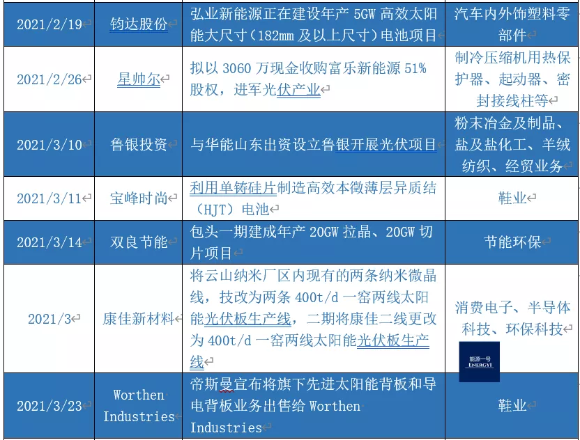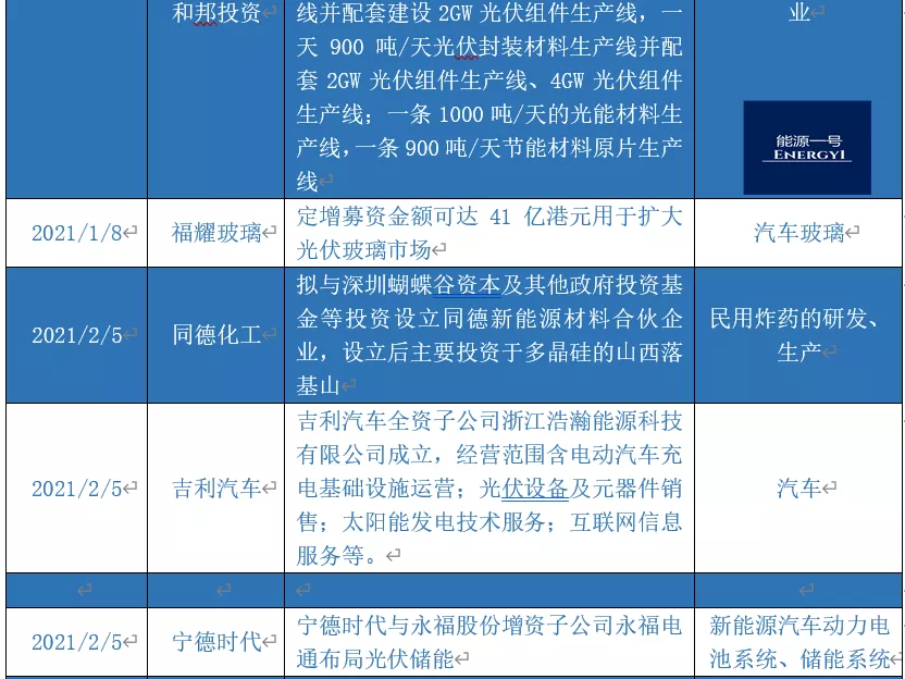 碳中和、碳達(dá)峰的目標(biāo)確定,讓世界看到了中國光伏產(chǎn)業(yè)的巨大潛力,也讓敏銳的商人們嗅到了商機(jī)。能源一號(hào)對去年以來一些重大的新投資進(jìn)行盤點(diǎn),發(fā)現(xiàn)不少公司正在進(jìn)入這個(gè)蒸蒸日上的行業(yè),同樣,產(chǎn)業(yè)之間的競爭也將更為白熱化。