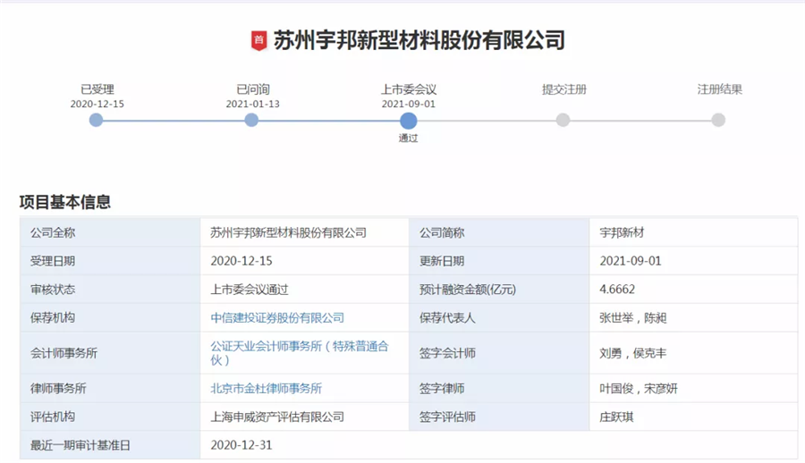 9月1日,據深圳證券交易所創業板發行上市審核信息公開網站顯示,蘇州宇邦新型材料股份有限公司(以下簡稱“宇邦新材”)已通過上市委會議,將于深交所創業板上市。