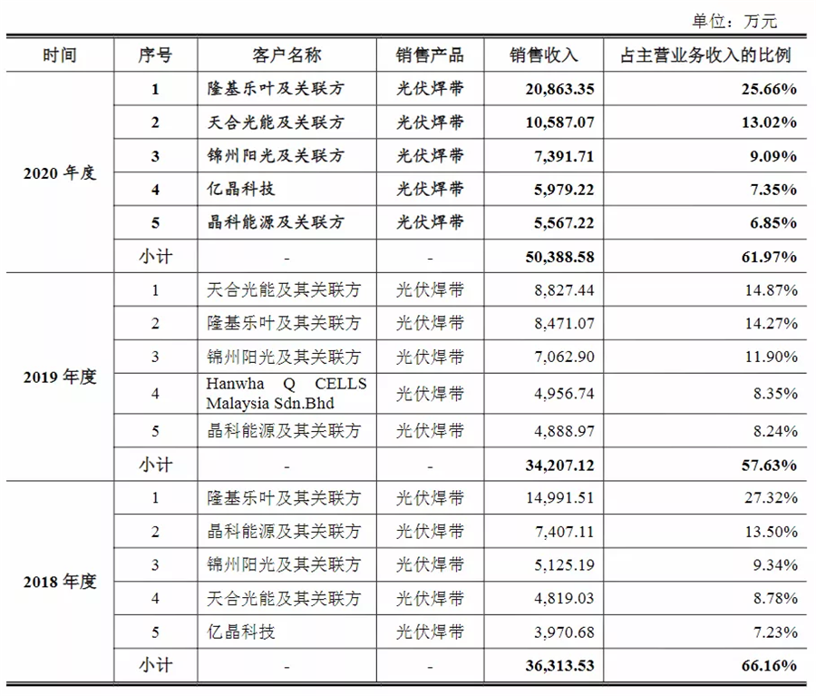 根據宇邦新材的招股說明書顯示,2019年,隆基股份是宇邦新材的第二大客戶,銷售收入為8471萬元,占比還稍低于天合光能。但在2020年,隆基股份不僅成為了宇邦新材第一大客戶,同時銷售收入也提高至2.086億元,占比高達25.66%。是其營收增長的重要支撐。
