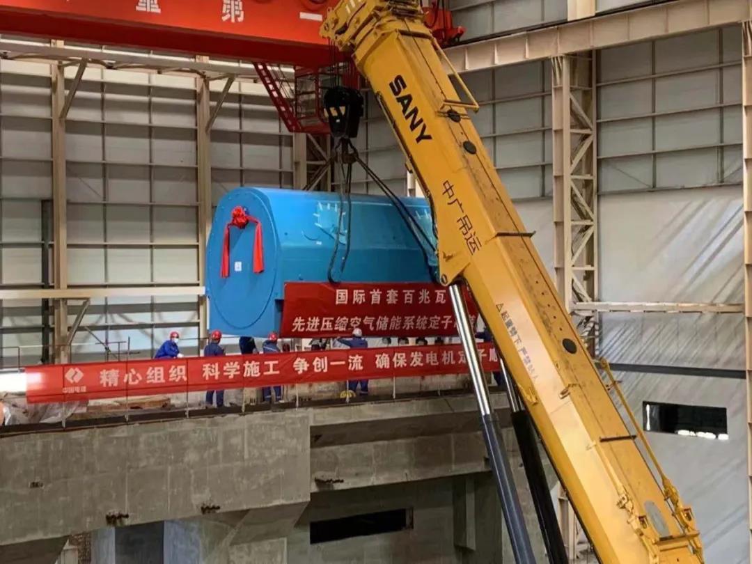 國際首套100MW先進壓縮空氣儲能發電機定子順利吊裝就位
