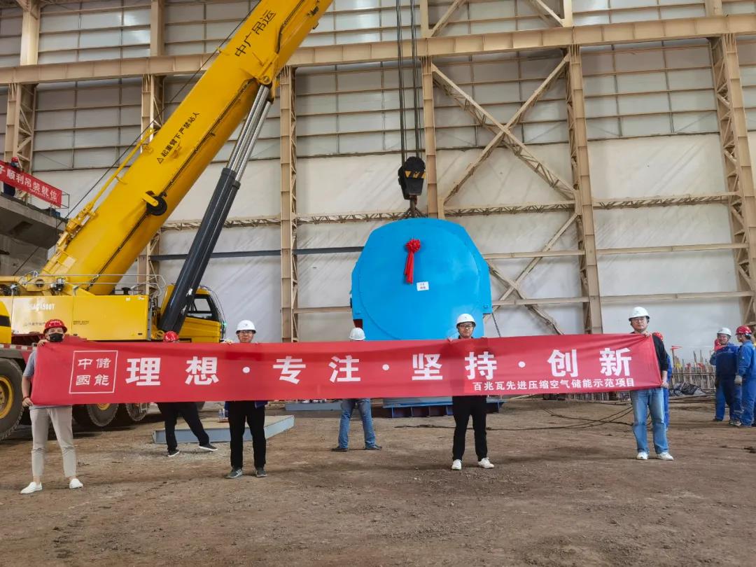 該項目是國家發改委立項支持的國家可再生能源示范區重大示范項目,是國際首套100MW先進壓縮空氣儲能示范電站,建設規模為100MW/400MWh,系統設計效率70.4%,項目建設地為河北省張家口市張北縣廟灘云計算產業園。項目由張北巨人能源有限公司(巨人集團)投資,技術來源為中國科學院工程熱物理研究所,由中儲國能(北京)技術有限公司提供全套設備。此次定子吊裝的順利完成,標志著張家口國際首套100MW先進壓縮空氣儲能國家示范電站進入核心設備安裝的關鍵階段,目前各項工作進展順利。