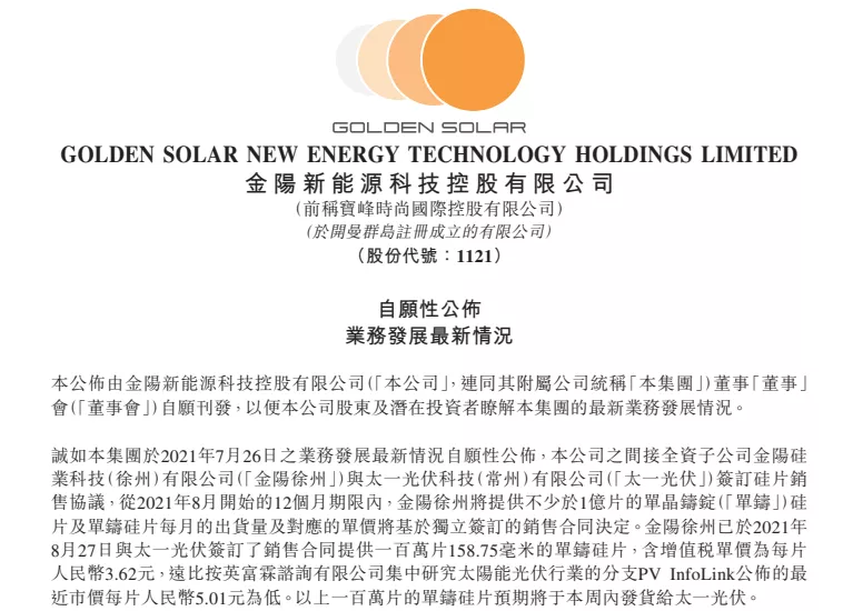 公告稱,公司間接全資子公司金陽硅業科技(徐州)有限公司(以下簡稱"金陽徐州")與太一光伏科技(常州)有限公司(以下簡稱"太一光伏")簽訂硅片銷售協議,從2021年8月開始的12個月期限內,金陽徐州將提供不少于1億片的單晶鑄錠("單鑄")硅片及單鑄硅片每月的出貨量及對應的單價將基于獨立簽訂的銷售合同決定。
