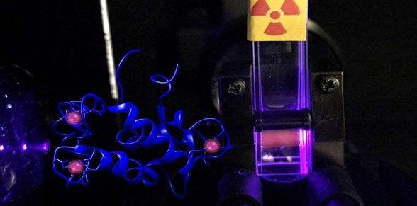 在LLNL熒光光譜實(shí)驗(yàn)中,蛋白質(zhì)鑭調(diào)素(lanmodulin)樣品暴露在右側(cè)的紫外光下時(shí),會(huì)使放射性核素鋦發(fā)光。這個(gè)示意圖(左)代表了鋦-蛋白質(zhì)絡(luò)合物的結(jié)構(gòu),每個(gè)蛋白質(zhì)分子“鍵接”三個(gè)鋦原子。