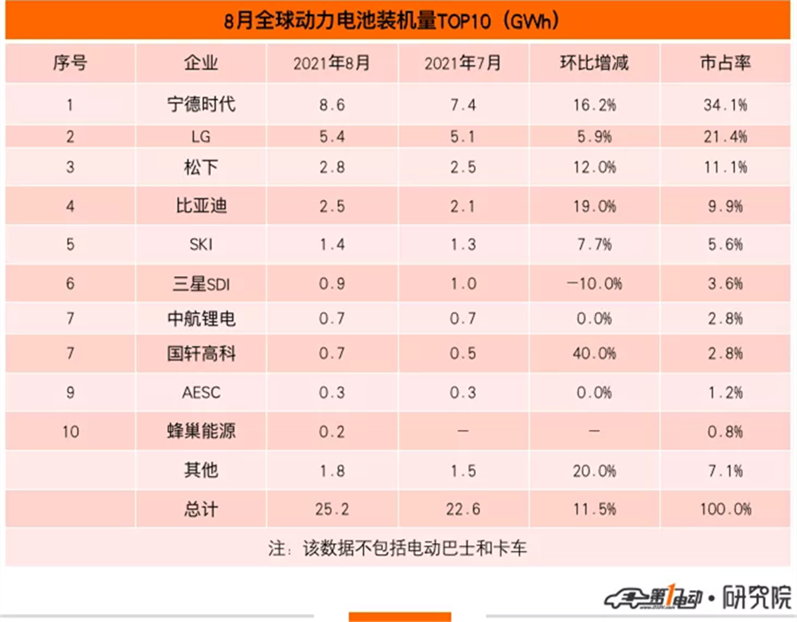 8月,寧德時代繼續高歌猛進,穩坐冠軍寶座,LG、松下分列季軍和亞軍。正在慢慢逼近松下的比亞迪和SKI分列前五;三星SDI、中航鋰電、國軒高科、遠景AESC、蜂巢能源分列前十。